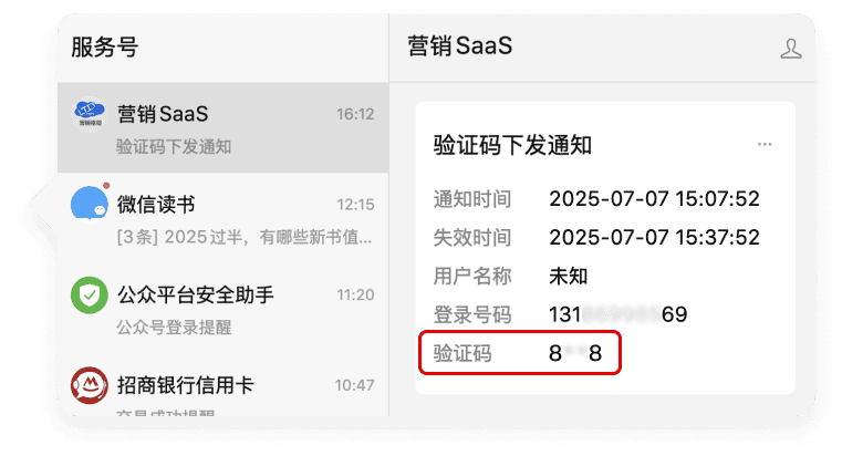 驗(yàn)證碼將通過“營銷SaaS”公眾號下發(fā)